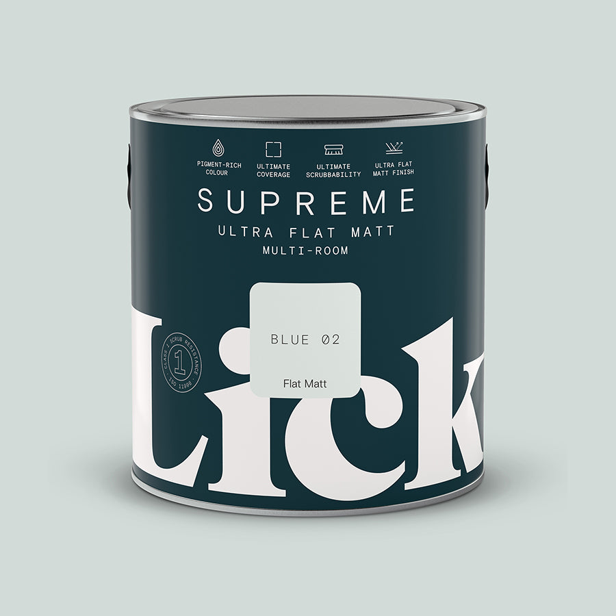 Pale and interesting Blue 02 puts the focus on its mint green undertone. The result is a blue that's ultra clean for a light, bright colour scheme, plus a matt finish that will minimise glare and maximise coverage of any imperfections.