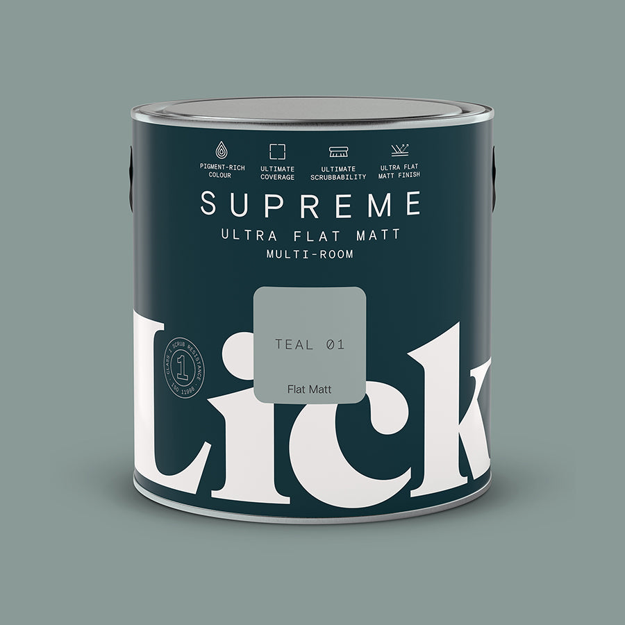 Lick Teal 01 paint is a subtle mid green shade possessing grey blue undertones. Ideal as a backdrop for statement pieces of furniture or decor.