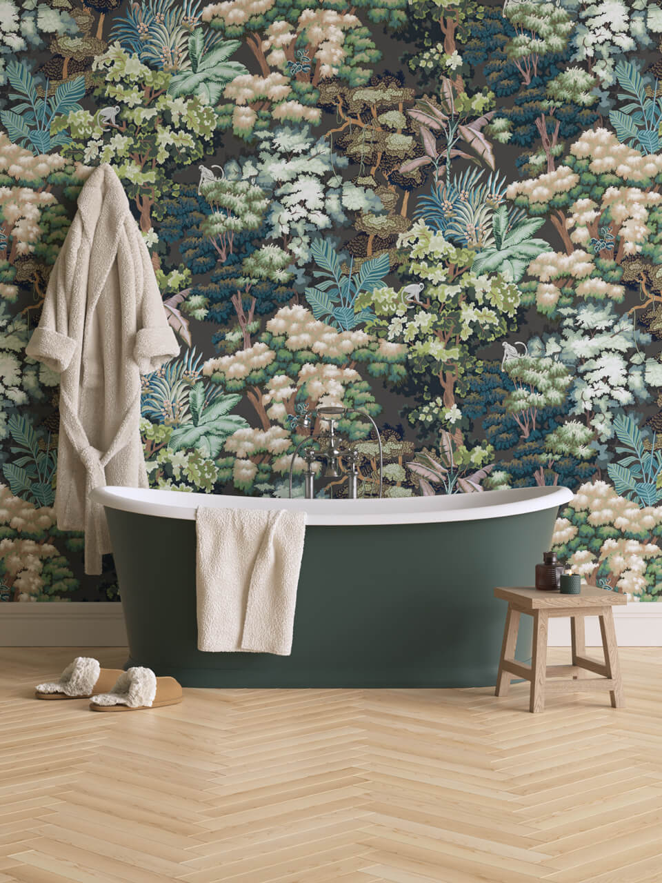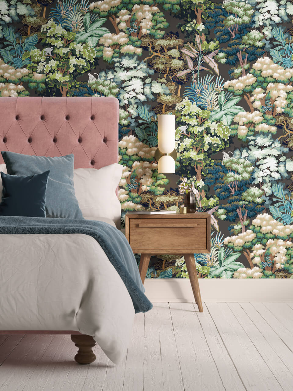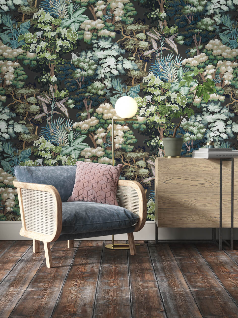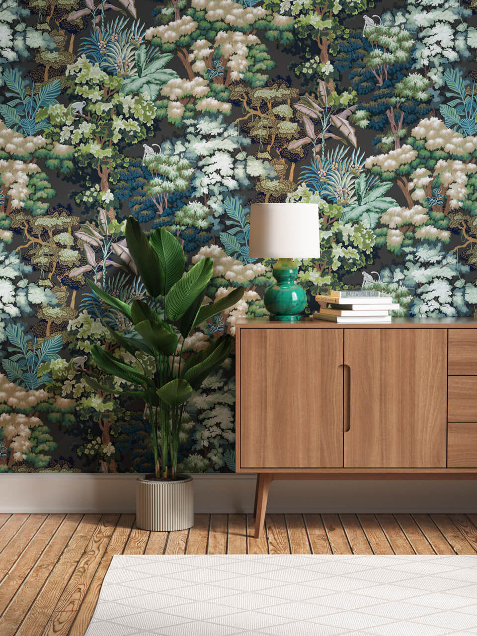 Canopy 02 is a dark jungle wallpaper with monkey motifs against moody blacks, greens & blues. Elevate your decor with this easy, paste-the-wall wallpaper.
