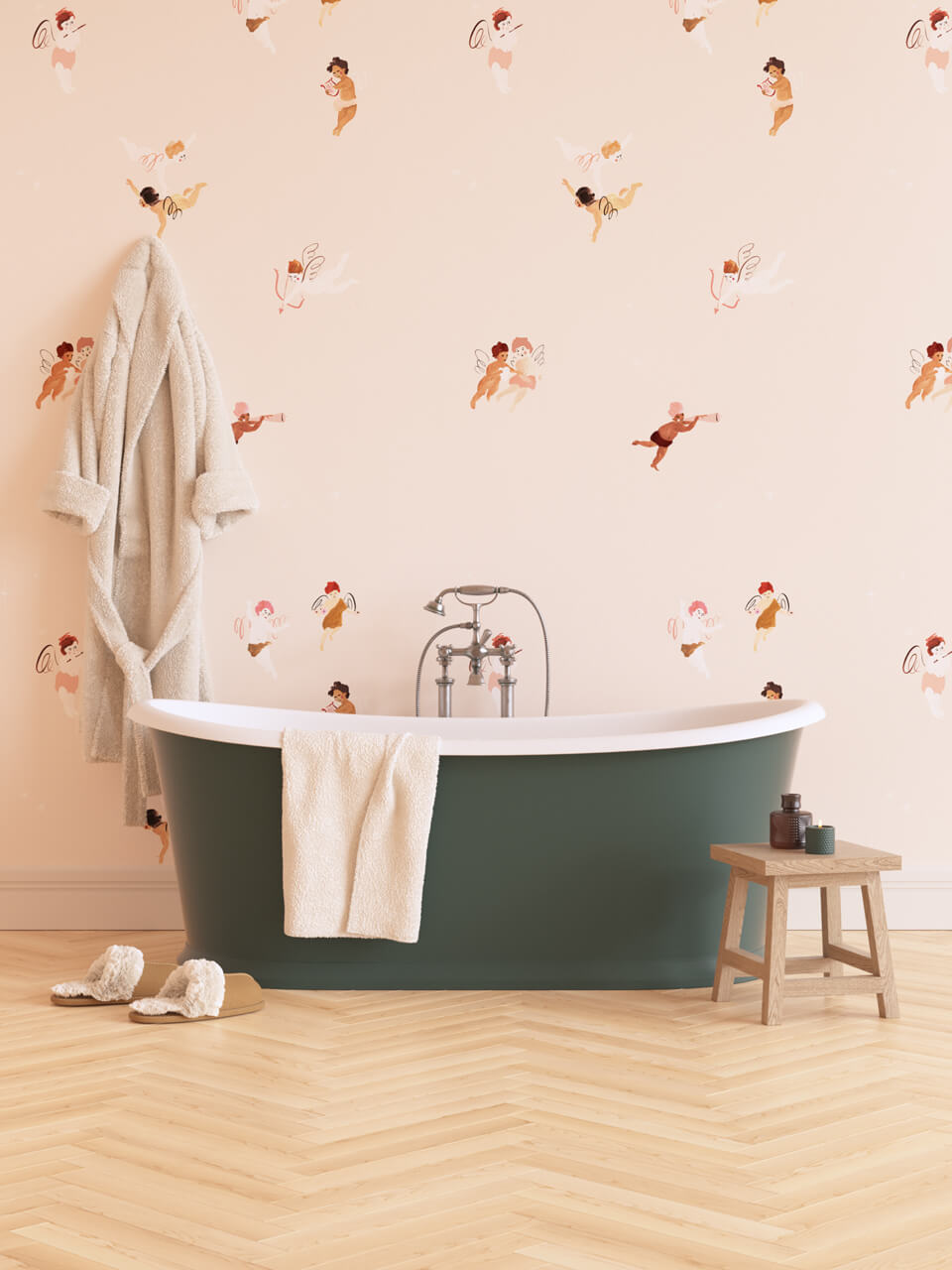 Cherub 01 is a soft pink wallpaper illustrated with hand-painted cherubs. Give classic decor a modern twist with this easy, paste-the-wall wallpaper.
