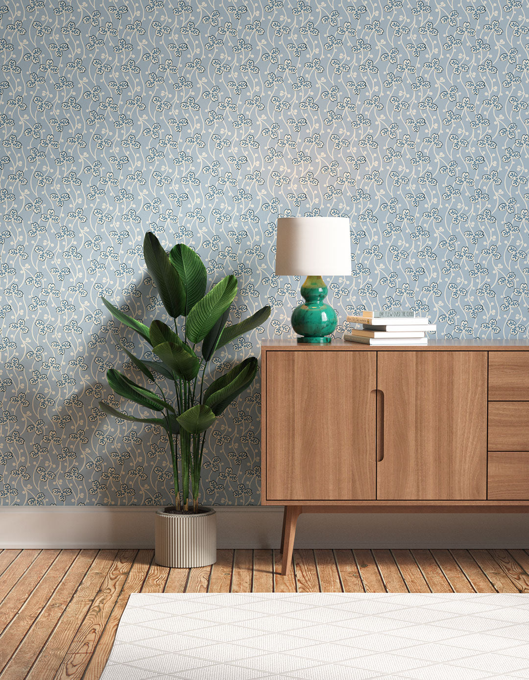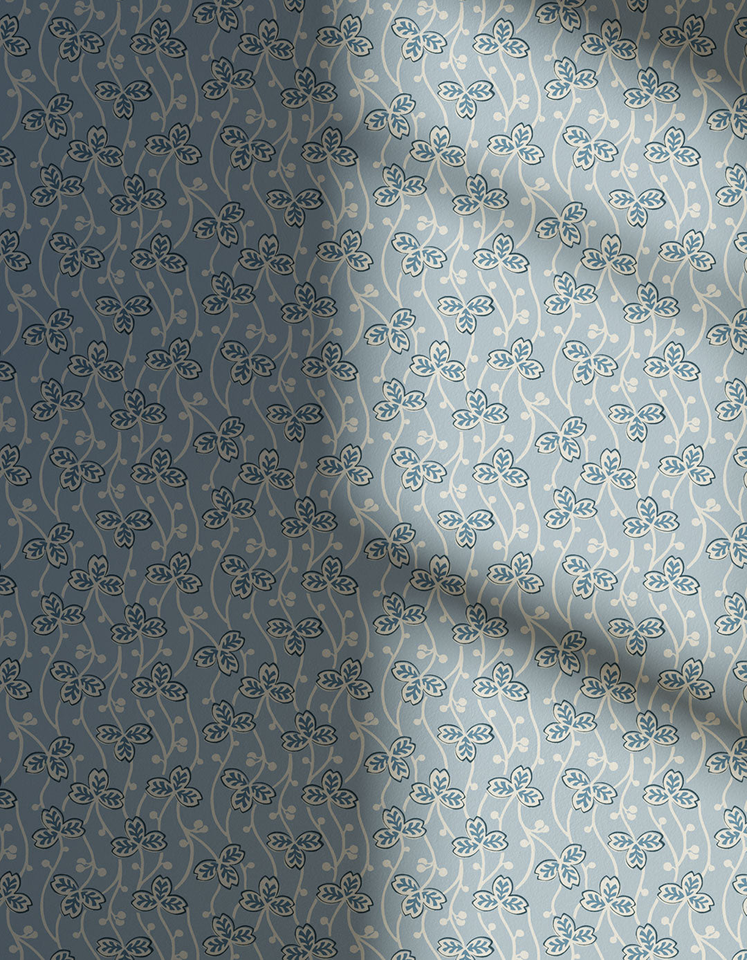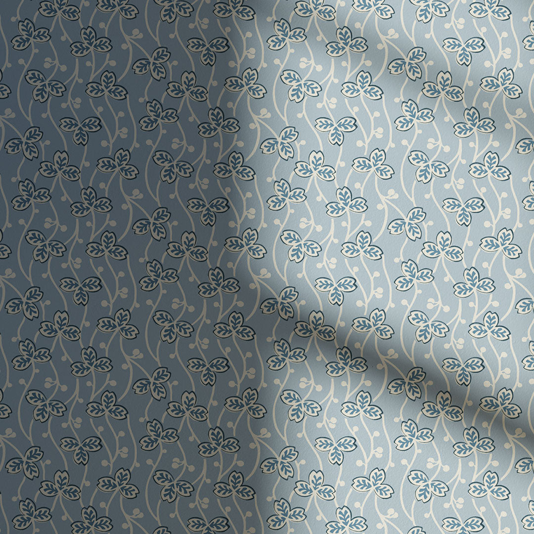 Clover 03 looks how a fresh spring morning feels. Recreated from an early 1900's French print, this relaxing yet refreshing wallpaper features serene blue and white leaves cascading from ceiling to floor, dotted along delicate white vines. Available as a full paste-the-wall roll or sample.