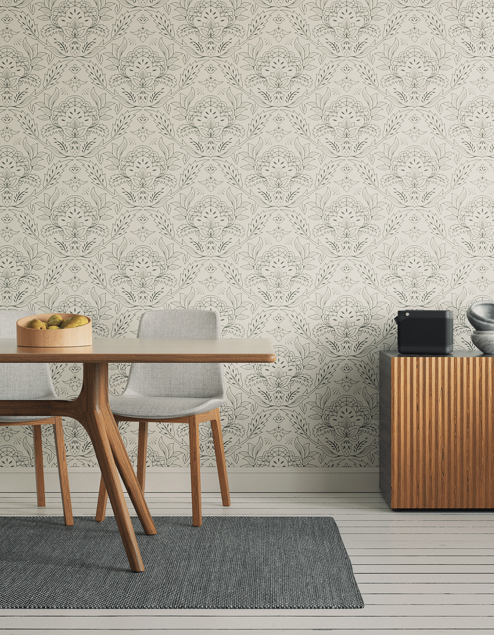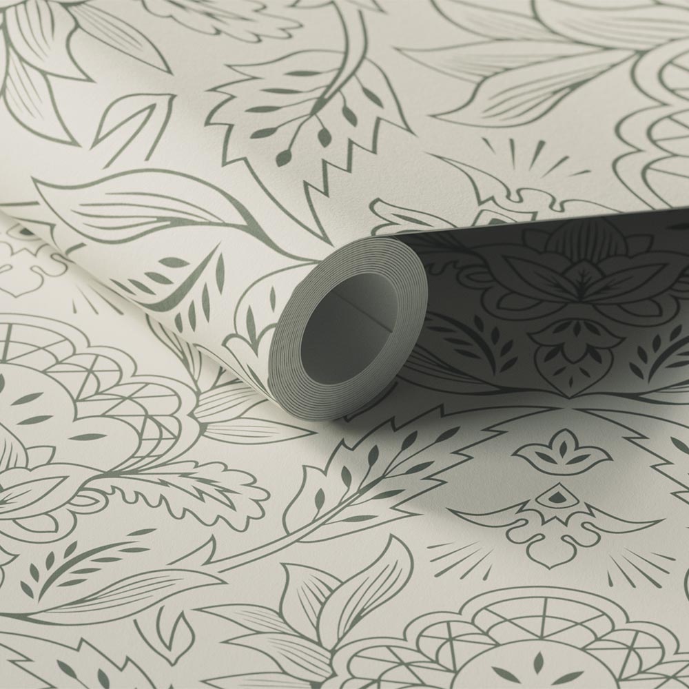 Lick Damask 01 Wallpaper shows art nouveau style damask print designed in Green 02 and White 03 and is printed on fine grade Toll Coated Non-Woven paper.