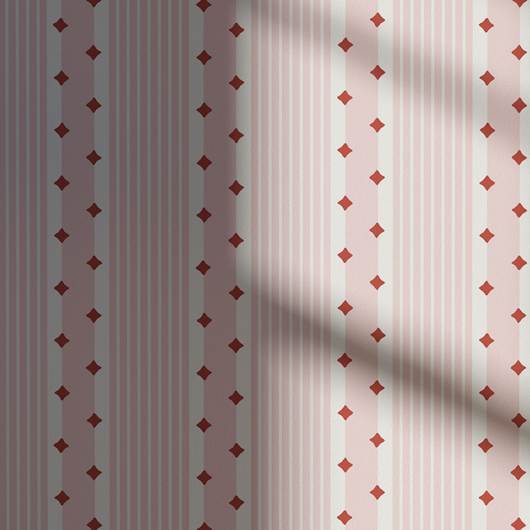 Taken straight from an 19th century fabric design, this pink stripe wallpaper is too gorgeous to be lost. The diamonds and stripes create structure, while the earthy red, soft pink, and easygoing white add warmth and playfulness to Diamond 01. Available in a paste-the-wall roll and sample format.